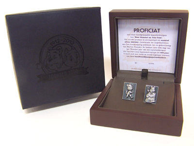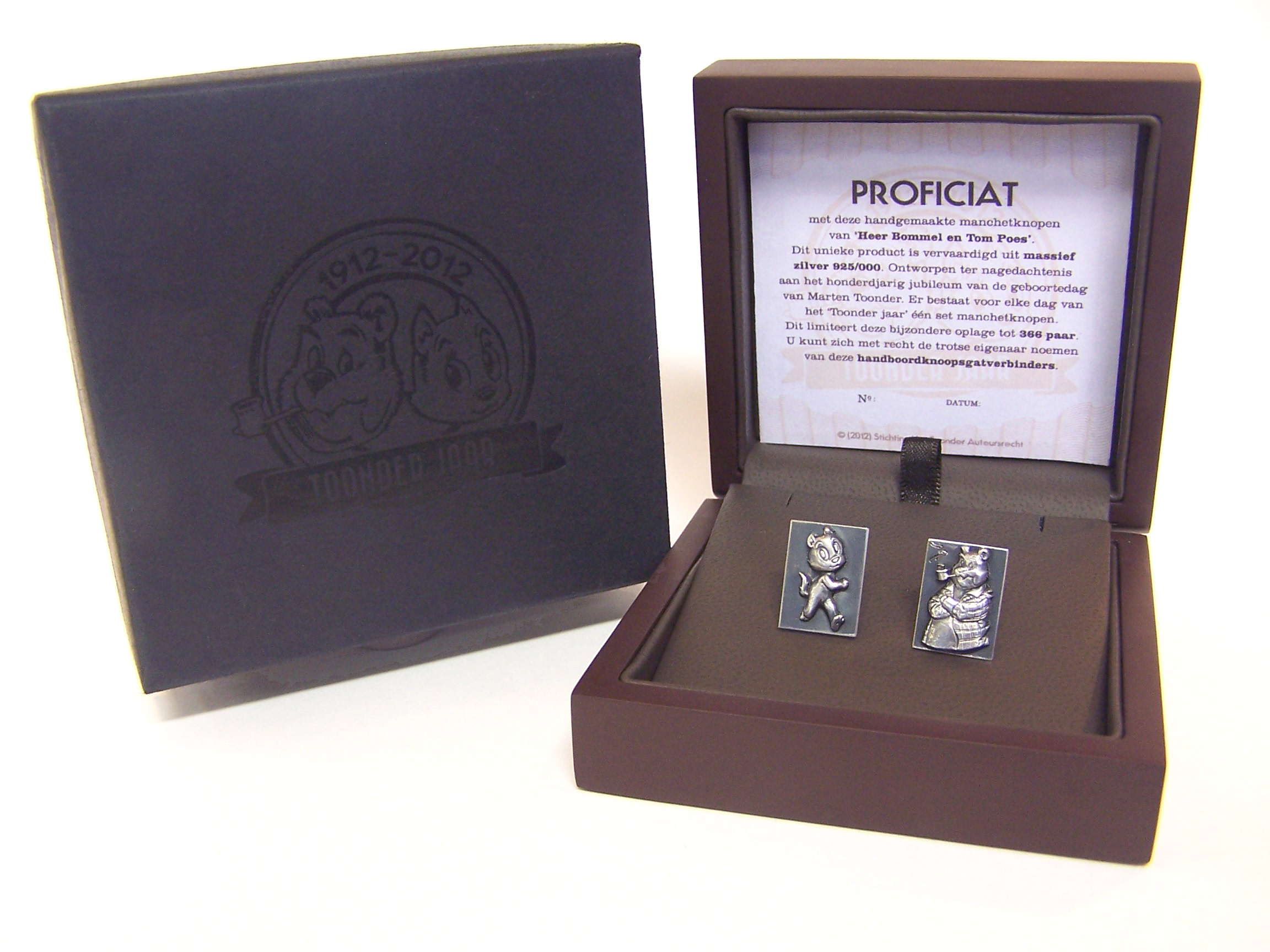 Heer Bommel en Tom Poes manchetknopenDeze handgemaakte manchetknopen van 'Heer Bommel en Tom Poes' zijn bedacht en ontworpen bij Ndesign. Als fanatieke bommelfans konden we het niet laten om deze handboordknoopsgatverbinders met u te delen. De manchetknopen zijn vervaardigd uit massief zilver 925/000.Ontworpen ter nagedachtenis aan het honderdjarig jubileum van de geboortedag van Marten Toonder. Er bestaat voor elke dag van het 'Toonder jaar' slechts één set manchetknopen. Dit limiteert deze bijzondere oplage tot 366 paar. De manchetknopen worden geleverd in een luxe geschenkverpakking met handgravure van een door u aangedragen datum of naam. Elke set is tevens voorzien van een eigen serienummer. Dit maakt het nog unieker. De prijs per set bedraagt slechts € 189,- exclusief verzendkosten. Reserveer nu tijdig, voordat de oplage vergeven is. Dit kan door te bellen op telefoonnummer 0651831576 of te mailen naar info@ndesign.nl |