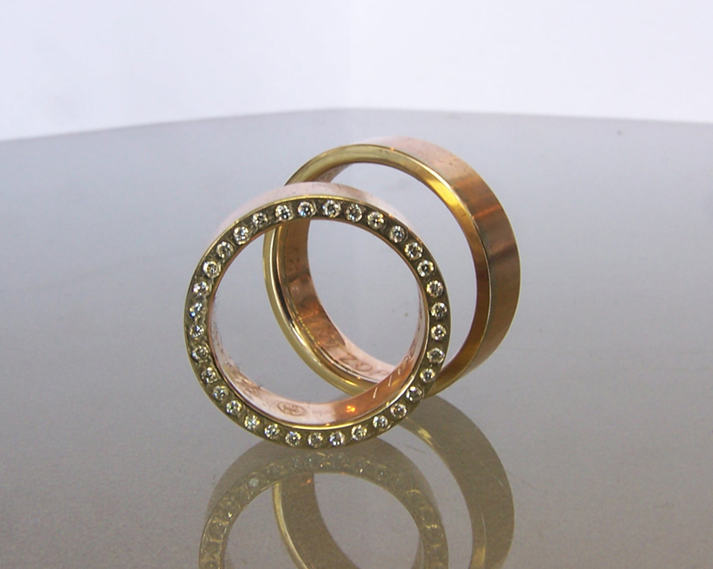 Trouwringen in geel en witgoud met satijn geborstelde finish